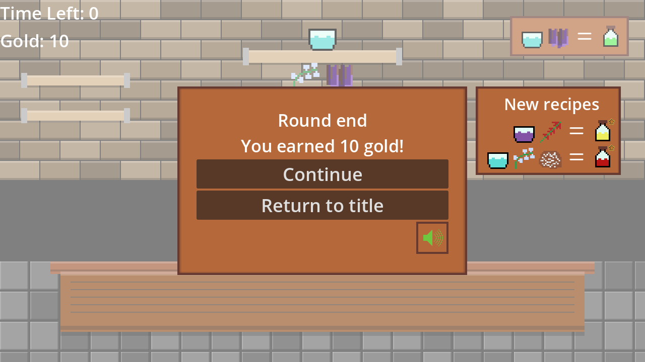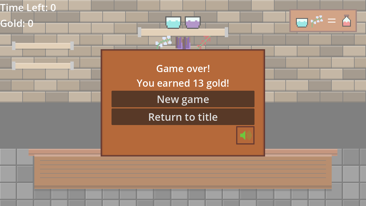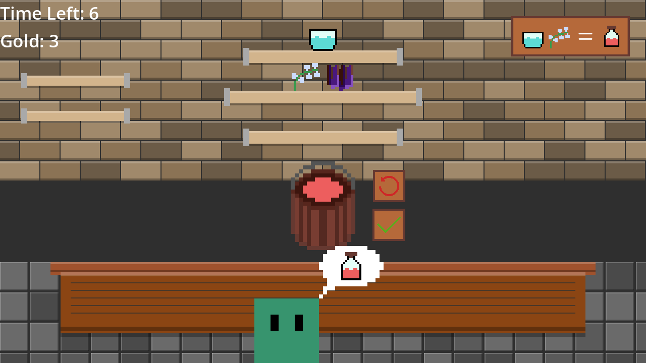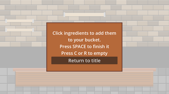 Click ingredients to add them to your bucket. Click Finish, or press SPACE to finish a potion. Press R or C to empty the bucket and start over. Every few rounds you will unlock new potions and ingredients. A hint on how to make the current requested potion is shown in the top right.